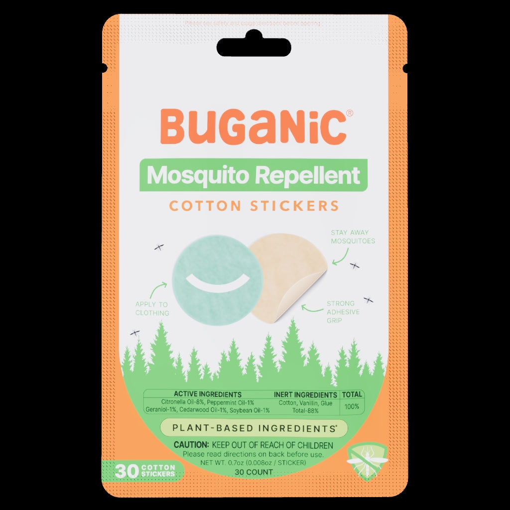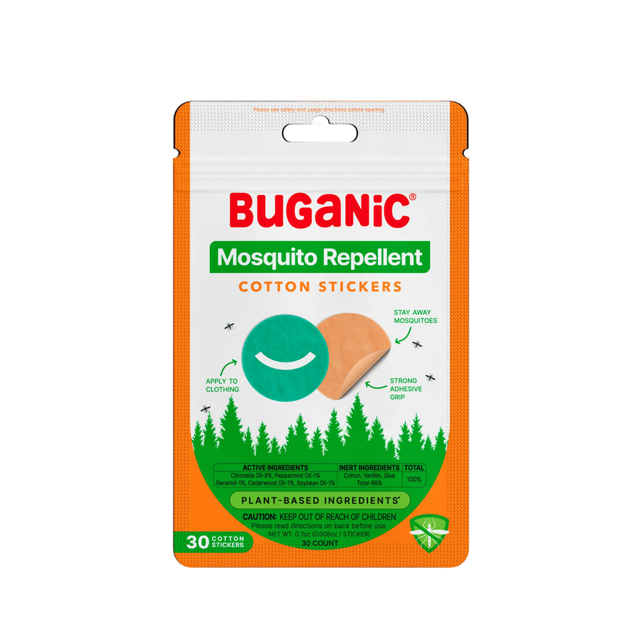 Buganic stickers use plant-powered essential oils on soft cotton patches placed on clothing, hats, strollers, or backpacks. They provide a naturally scented barrier without touching your skin.